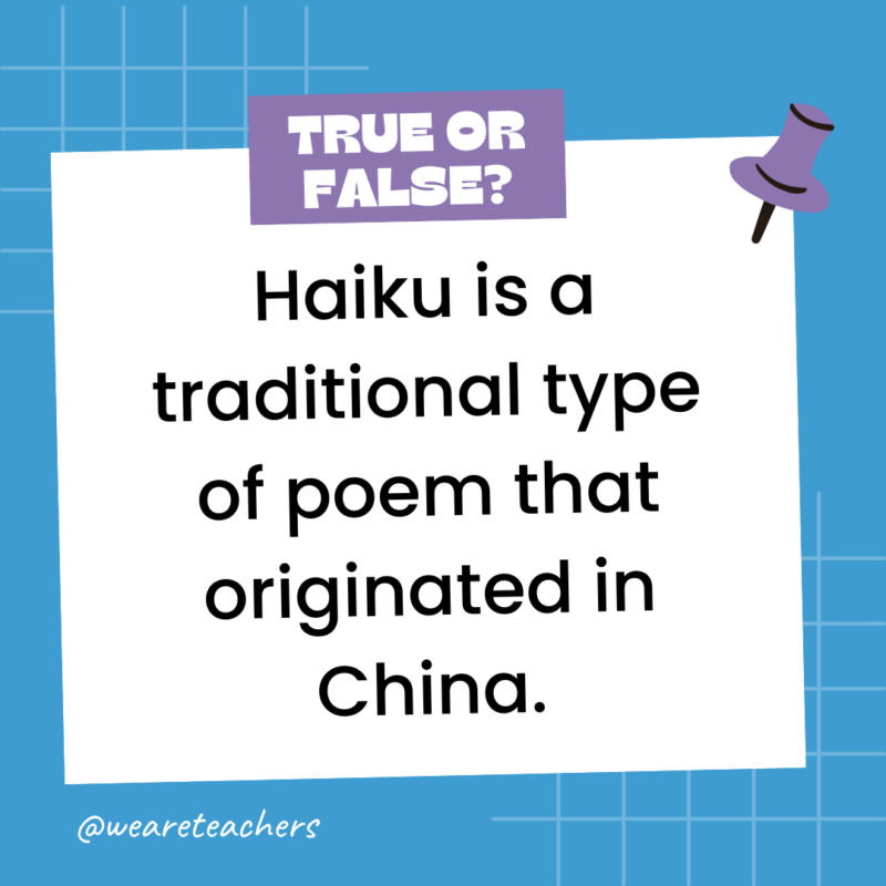 117. True or False: Haiku is a traditional type of poem that originated in China.