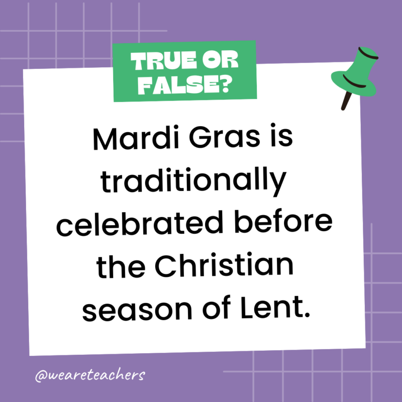 Answer: True. In fact, Mardi Gras literally translates to “Fat Tuesday,” which is the Tuesday before Ash Wednesday and the start of Lent.