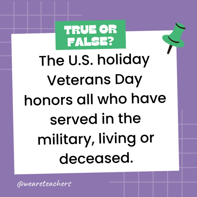 145. True or False: The U.S. holiday Veterans Day honors all who have served in the military, living or deceased.