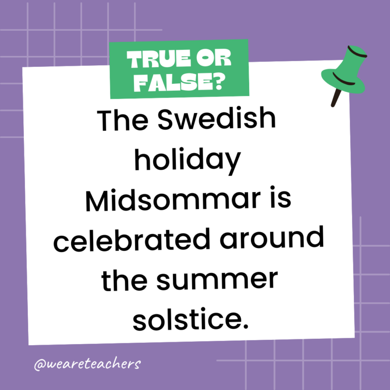 148. True or False: The Swedish holiday Midsommar is celebrated around the summer solstice.