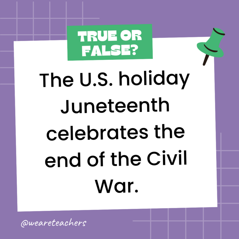 150. True or False: The U.S. holiday Juneteenth celebrates the end of the Civil War.