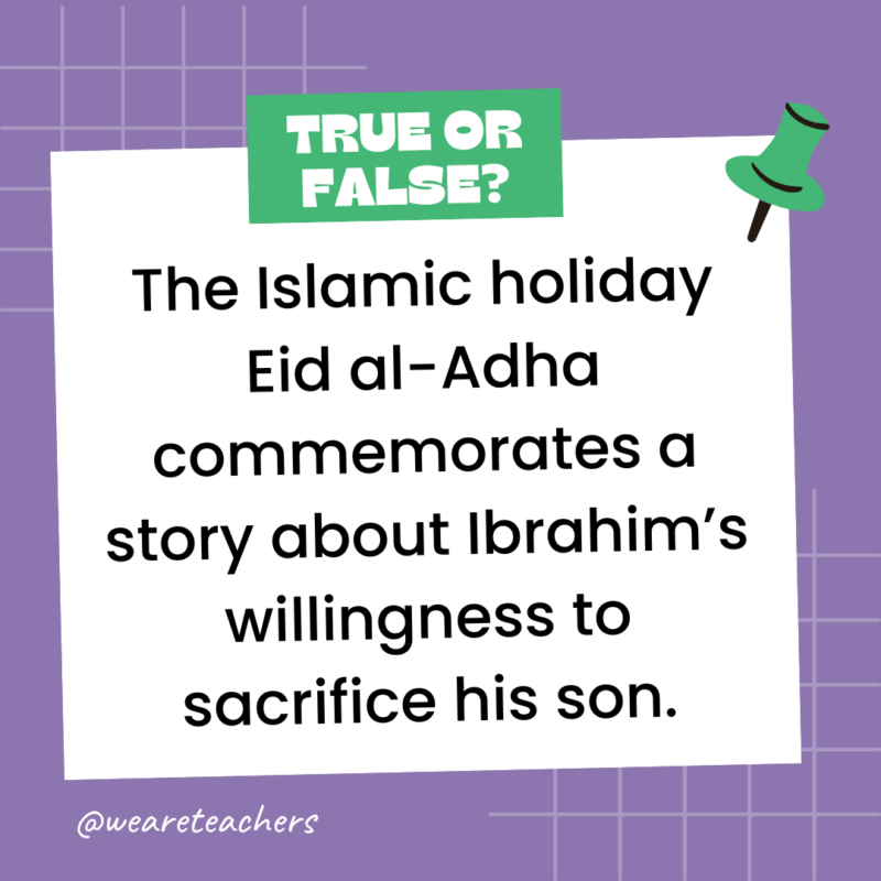 Answer: True. The holiday honors Ibrahim’s faith and obedience to God, and many families share meat with relatives and those in need during the holiday.