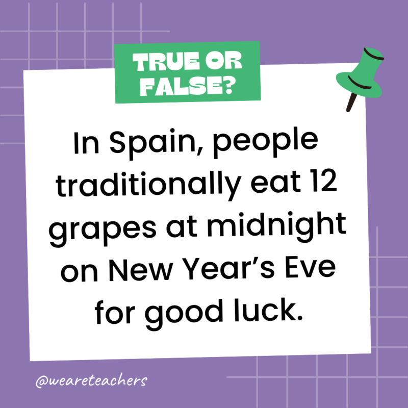 157. True or False: In Spain, people traditionally eat 12 grapes at midnight on New Year’s Eve for good luck.