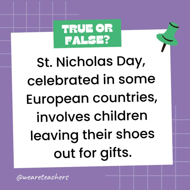 158. True or False: St. Nicholas Day, celebrated in some European countries, involves children leaving their shoes out for gifts.