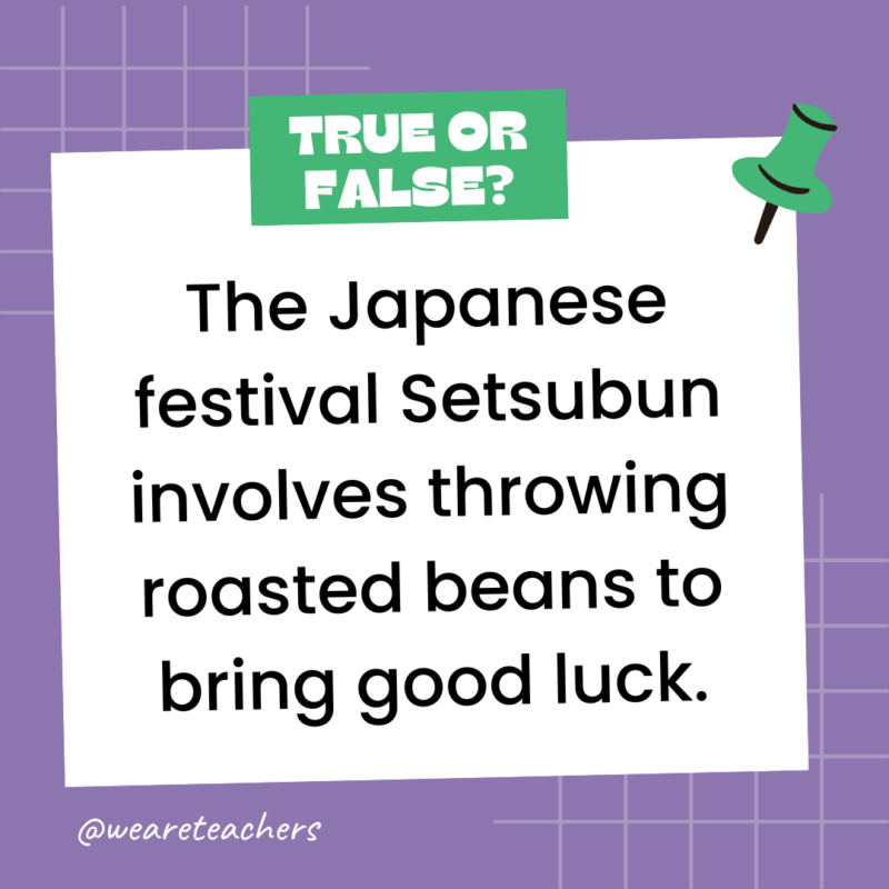 Answer: True. People toss roasted soybeans while chanting “Oni wa soto! Fuku wa uchi!” (“Demons out! Good fortune in!”) to drive away bad luck and welcome good luck.