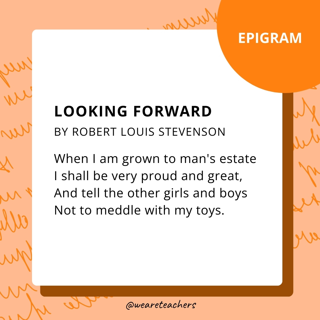 These short poems (generally six lines or less) express a witty thought in pithy, concise language. This term is also used for clever thoughts that aren’t written in verse, like Oscar Wilde’s “I can resist everything except temptation.” Epigrammatic poems are fun to read, making them one of the best poem types to share with kids.