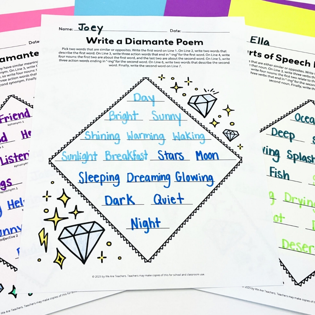 A diamante poem is a seven-line poem that takes the shape of a diamond. The word diamante comes from the Italian word for “diamond,” which reflects the poem’s shape. It’s designed to explore contrasts, relationships, or opposites using concise, powerful language. This type of poem has specific rules and comes in two types: synonym diamantes, where the beginning and end nouns are similar, and antonym diamantes, where the beginning and end nouns are opposites.