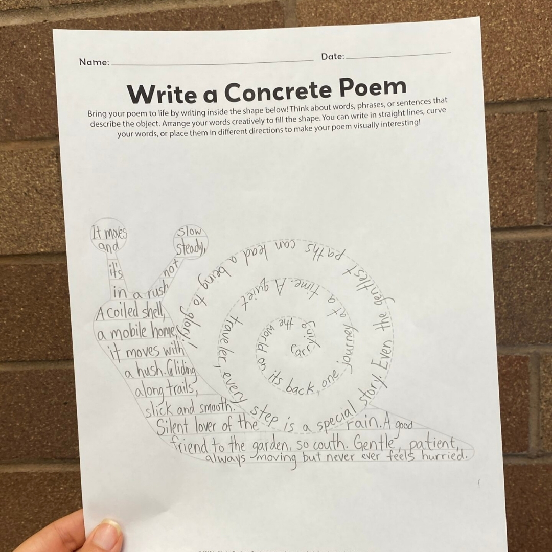 Poems written in this form take the shape of the item they’re describing. They can be written in any style, as long as the formatting creates a shape related to the words.