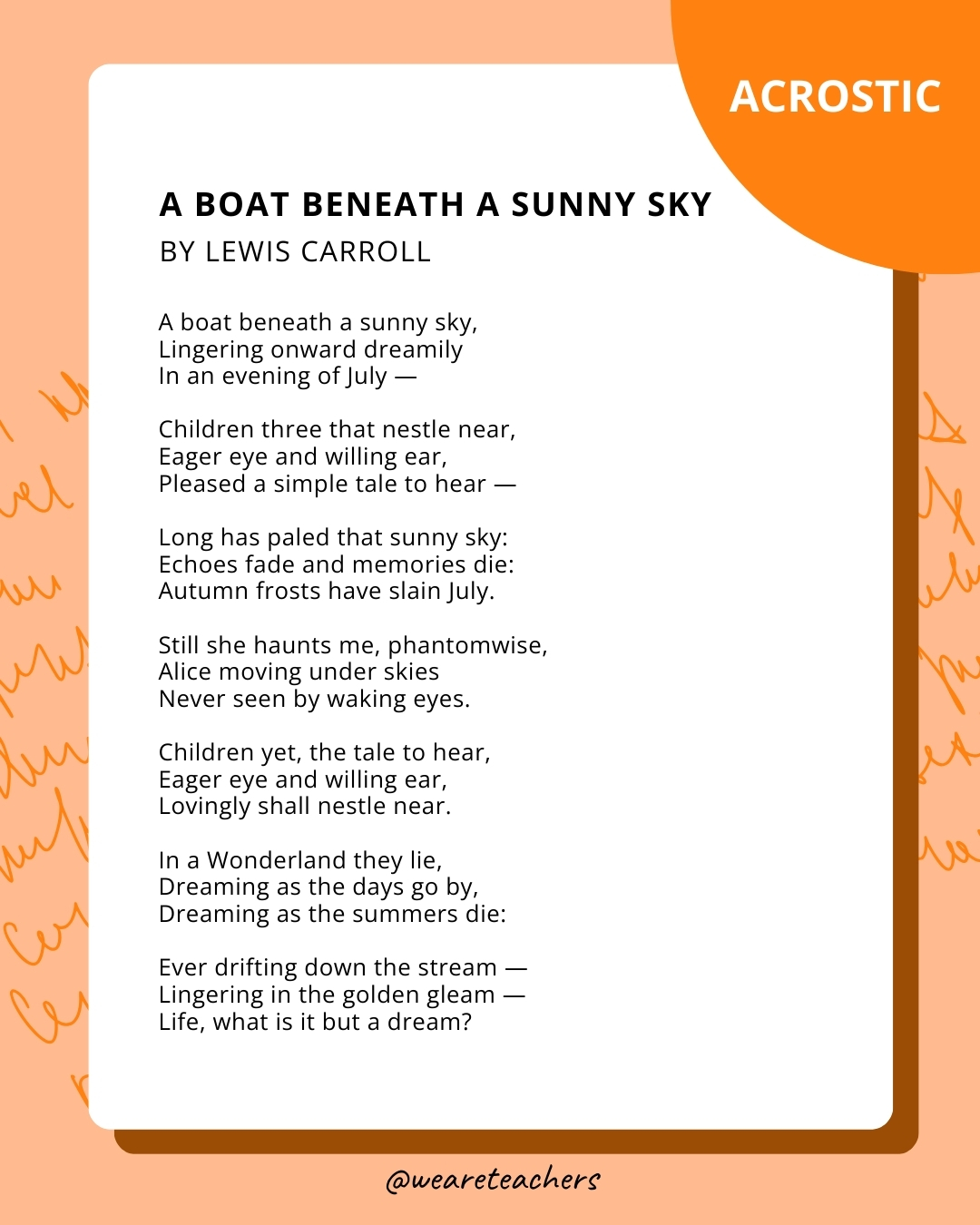 In an acrostic, the first letter of each line combined spells out a word or phrase that’s generally related to the topic of the poem. There are several different types of acrostic, including a double acrostic where both the first and last letters of each line spell out a message. Another type of acrostic is the abecedarian, where the first letter of each line goes in alphabetical order. Acrostics are often one of the first types of poetry kids learn, by writing a poem using the letters of their own name. The acrostic in Carroll’s “A Boat Beneath a Sunny Sky” is “Alice Pleasance Liddell,” the real-life inspiration for Alice in Wonderland.