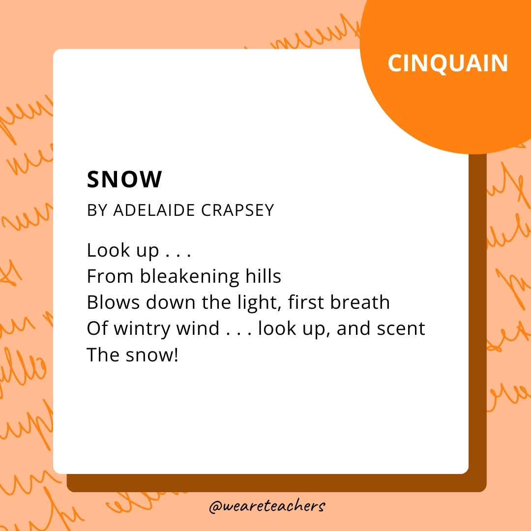Poet Adelaide Crapsey invented a specific type of cinquain (sometimes called the American cinquain), which has one stress in the first line, two in the second, three in the third, four in the fourth, and one in the fifth. This poetry type is popular in classrooms, since the strict structure helps students create their own poems.