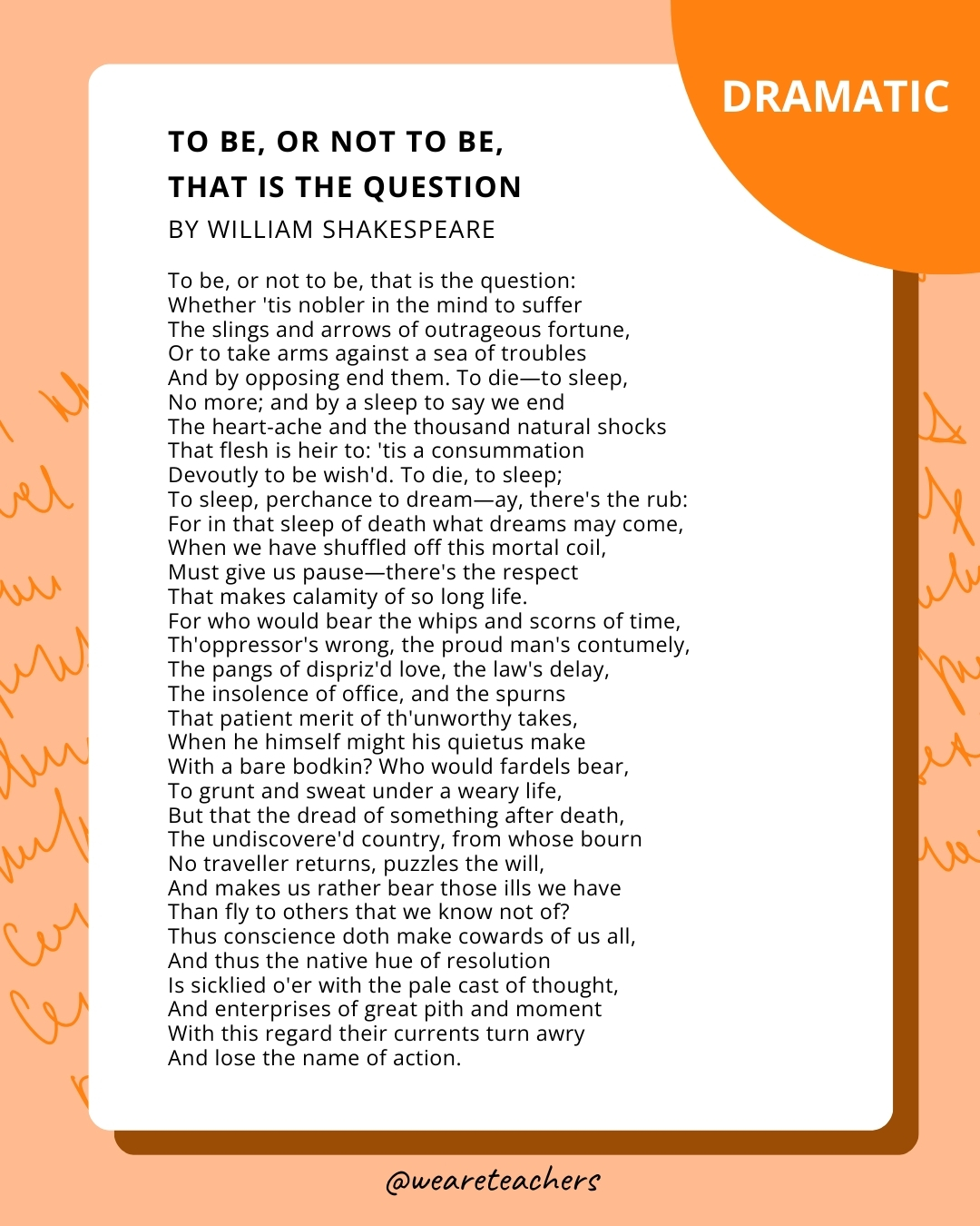 Poem Example: To Be, or Not To Be, soliloquy from Hamlet, by William Shakespeare