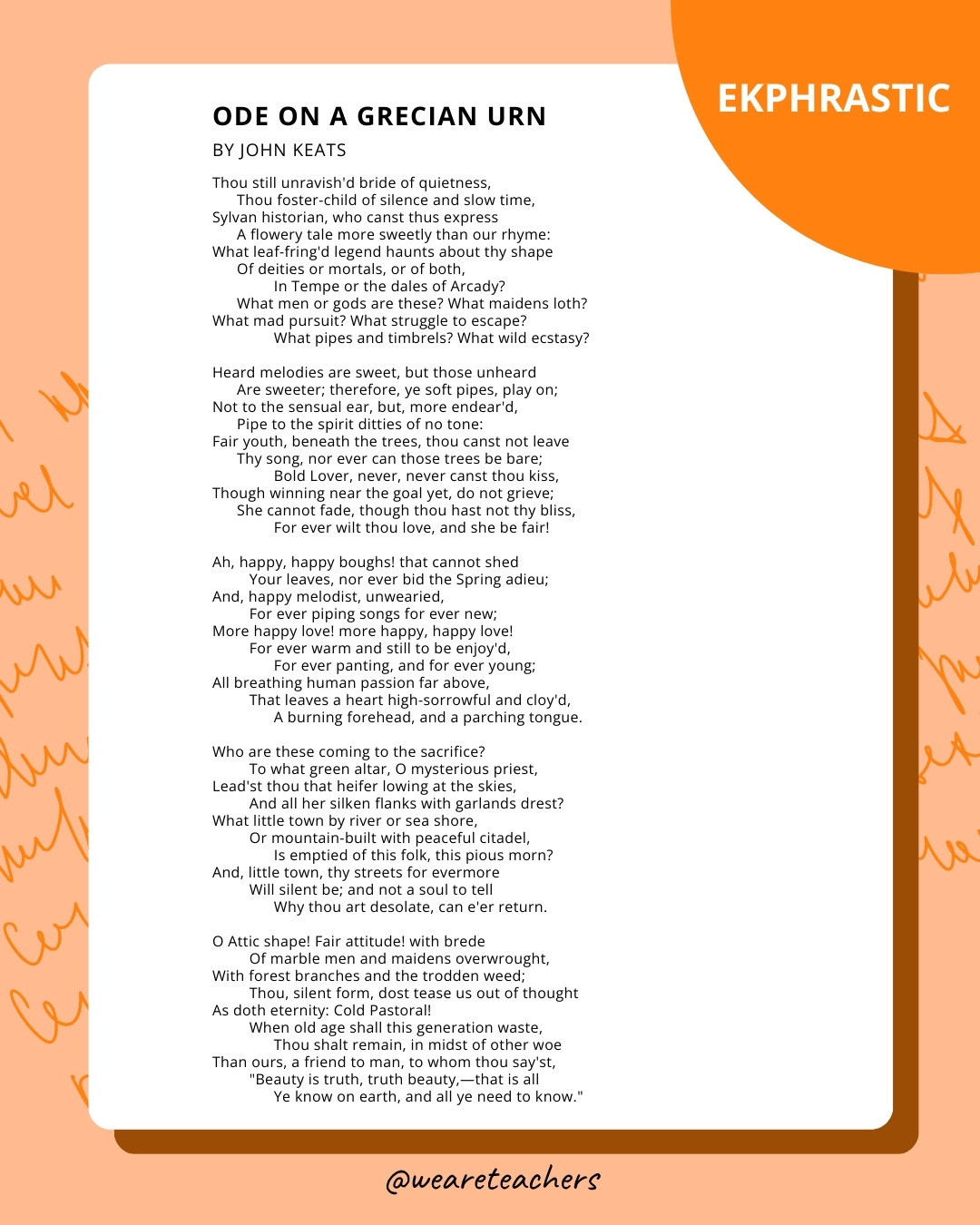 This is a broader category of poem types that describes poetry written to vividly describe a work of art. One of the most famous examples in poetry is John Keats’ Ode on a Grecian Urn. Ekphrastic poems are usually about visual arts like paintings or sculpture, but they can also describe music, performances, or even movies.