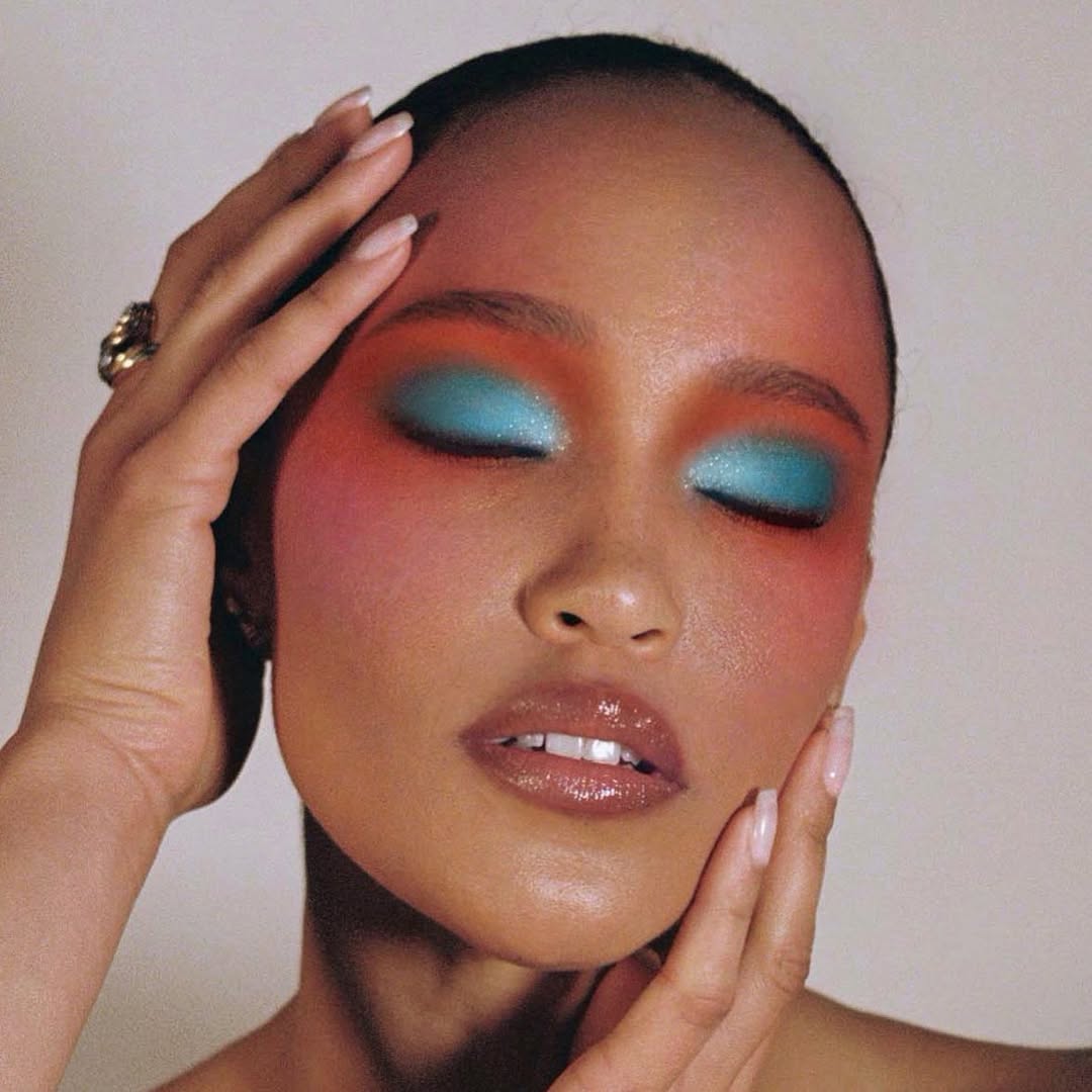 This style appeals to those drawn to vintage beauty with a modern twist. It features pastel blue eyeshadow, encircled by gentle orange, creating a dreamy halo effect on the lids with a cinematic finish.
