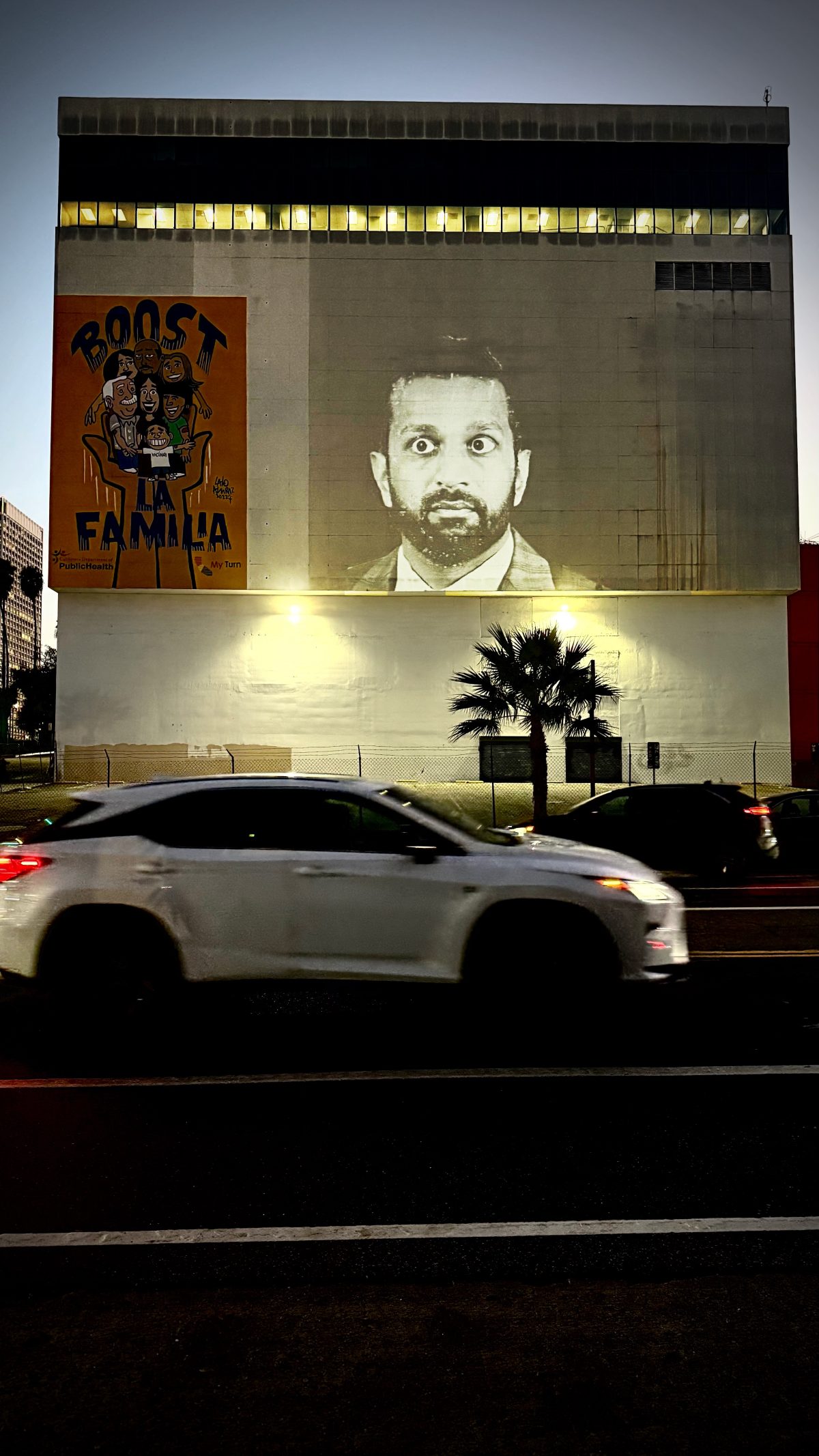 On September 22, a striking digital image of FBI Director Kash Patel, captured with wide eyes darting back and forth, illuminated a building at the intersection of 2nd Street and Beaudry Avenue in Downtown Los Angeles. This latest projection is part of a series of satirical artworks that have become fixtures across the city, portraying various political figures with a comedic twist—ranging from Donald Trump dramatically devouring the Epstein files to a reimagined Fox News branded as “Faux News,” and even an image of Trump silencing late-night host Jimmy Kimmel.
