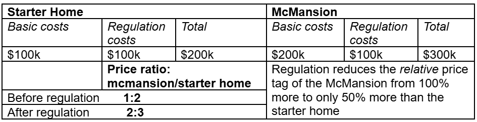 In a deregulated scenario, a starter home could be priced at half of that of a McMansion. But once regulatory costs are factored in, the starter home might only be priced at two-thirds of the McMansion’s cost. As regulatory costs escalate, the relative price of larger, more lavish homes declines, consequently discouraging builders and buyers from pursuing comparatively pricier starter homes.