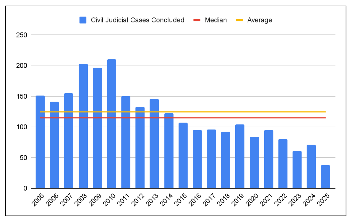 Annual number of civil judicial cases concluded from 2005-2025, with cases tracked from January 21 through November 30 each year and data from EPA ECHO. Image shows Figure 31 in the report Making America Polluted Again: The Trump EPA’s 2025 Enforcement Record.Â