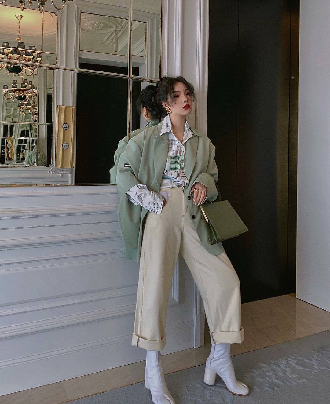 This approach to styling sage green in spring demonstrates how the color can evolve from soft and minimal to structured and expressive. By layering textures and patterns, the look remains dynamic without being overwhelming.