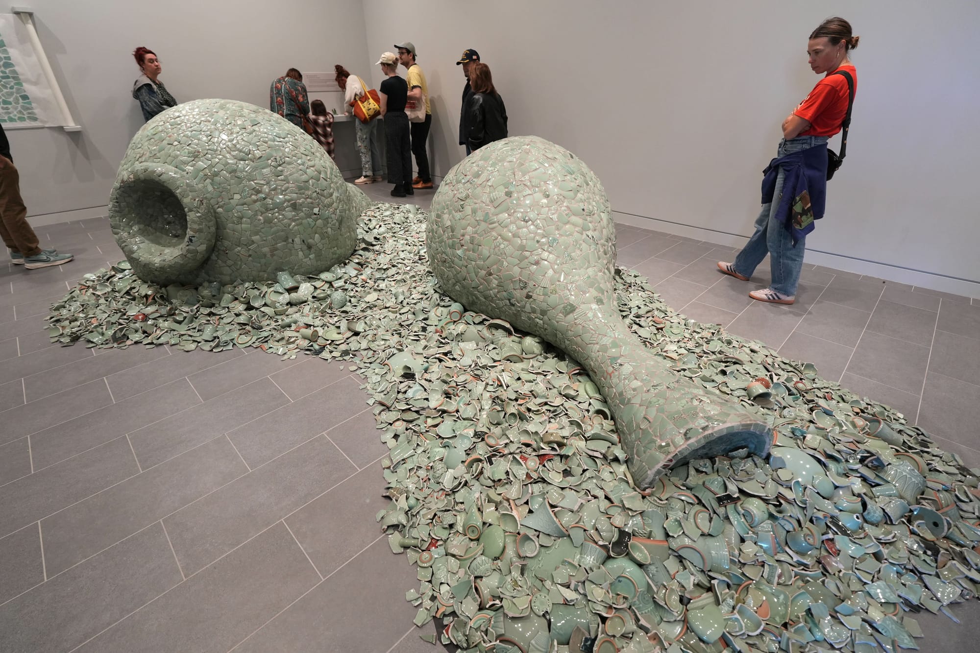 This gallery currently showcases Shin’s “Celadon Landscape” (2015–2019), previously exhibited at the Crow Museum of Asian Art in Dallas and the Sarasota Art Museum. The installation consists of two monumental mosaic vases, assembled from discarded pale blue-green ceramic shards, resting in a pool of ceramic fragments on the gallery floor.