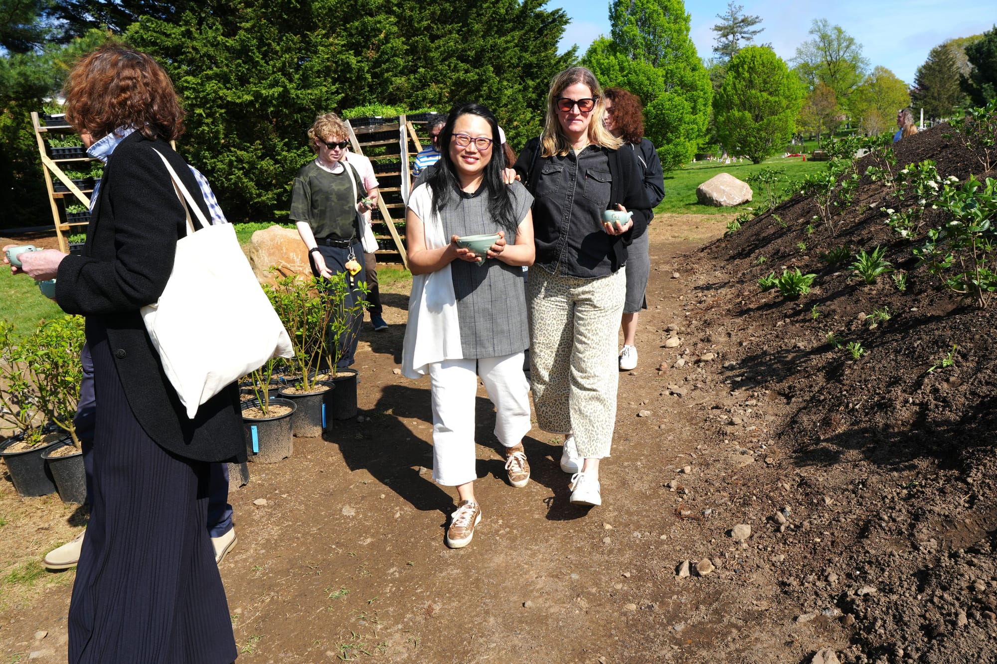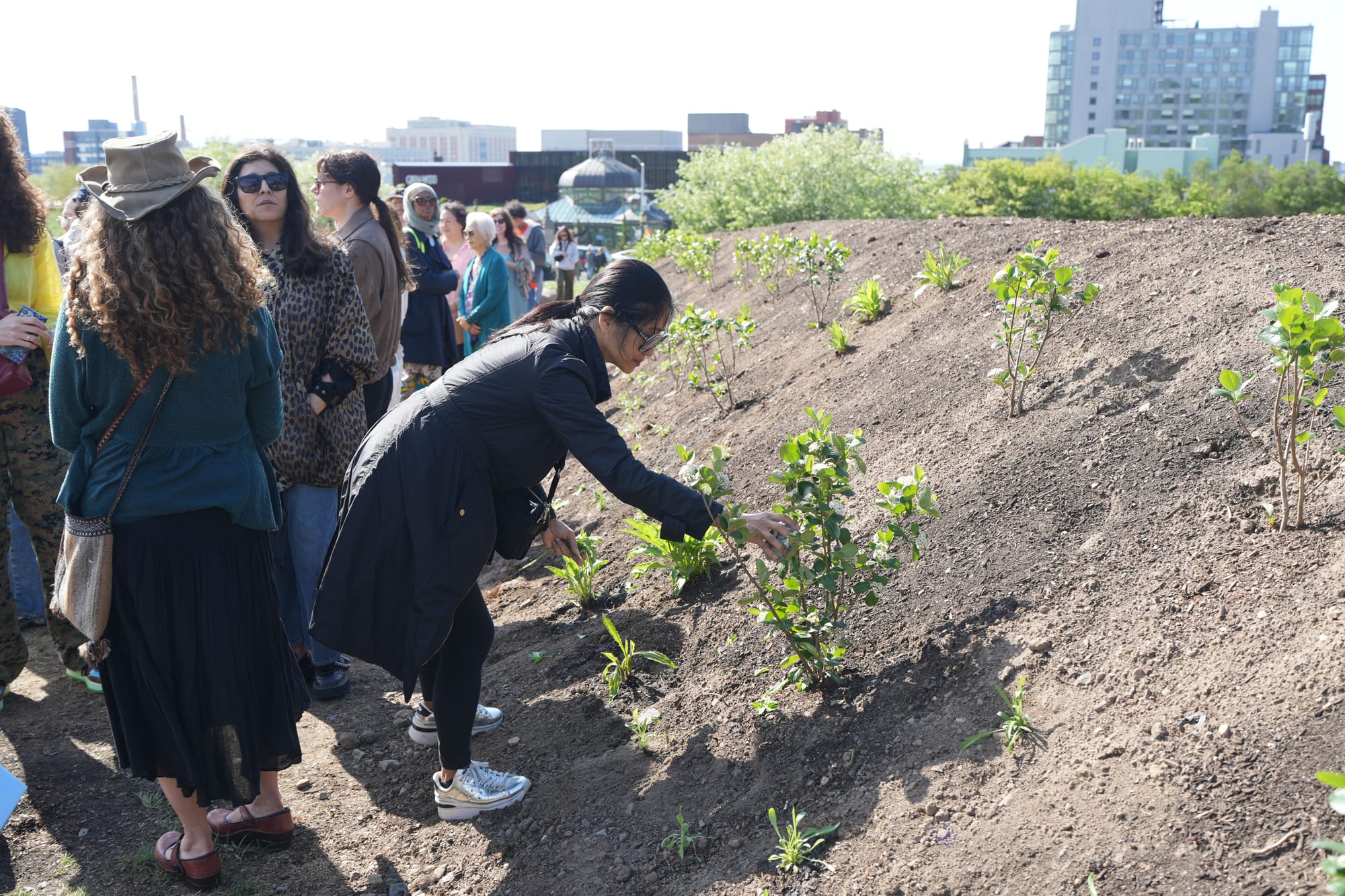 During a press preview on April 16, the trees were buried under a long, sloping, oval-shaped mound of soil by an excavator. At the event, which included a community ritual led by Korean shaman Mudang Jenn, volunteers planted wildflowers and shrubs atop the mound in shades of pink and green. As the trees decompose, they will enrich the soil, support microbes, and foster two interconnected ecosystems that benefit the plants above, transforming the installation into a living memorial.