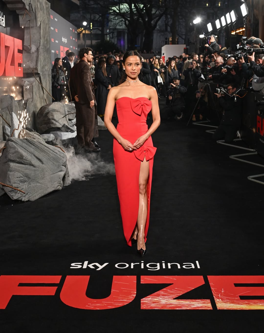 Elsewhere, Gugu Mbatha-Raw stood out at the London premiere of Fuze. She opted for an Alessandra Rich gown that combined elegance with whimsical details. The vivid crimson strapless dress featured a form-fitting silhouette that highlighted clean lines and refined tailoring, while oversized bow accents at the bust and hip added drama and femininity without overpowering the design.
