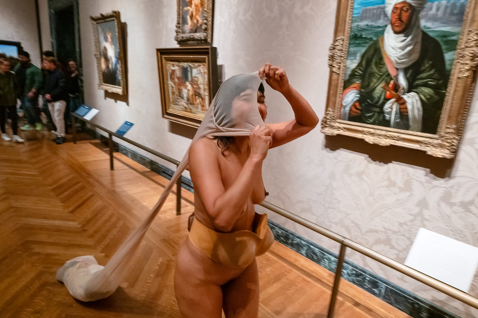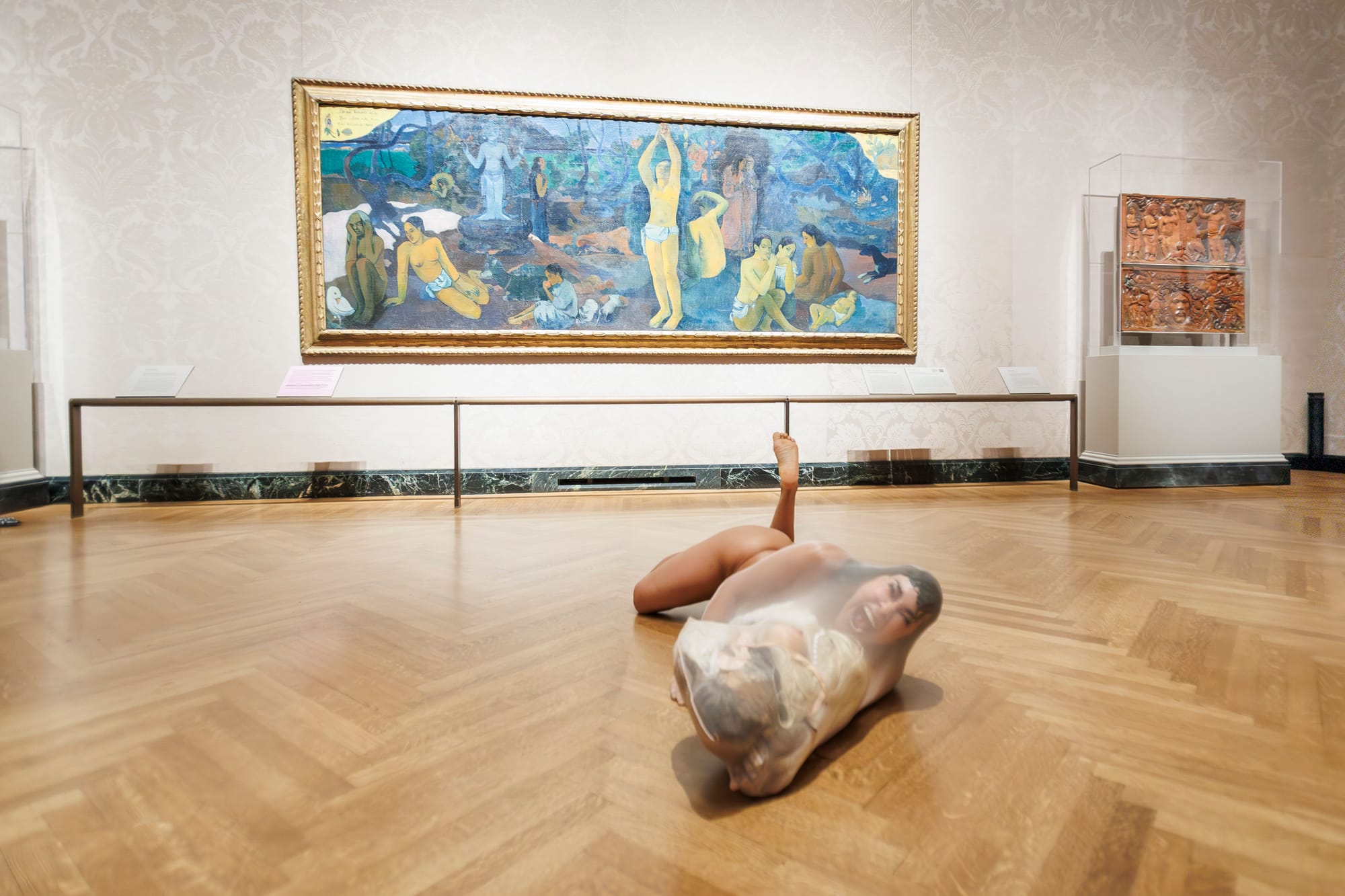 As Ibarra moved through the galleries, she transitioned from quiet steps to joyful laughter, which grew louder as she engaged with the artworks. Her interactions peaked in front of Paul Gauguin’s “Where Do We Come From? What Are We? Where Are We Going?” (1897–98), where her laughter became uncontrollable, leading her to the floor and into the nylon bag.