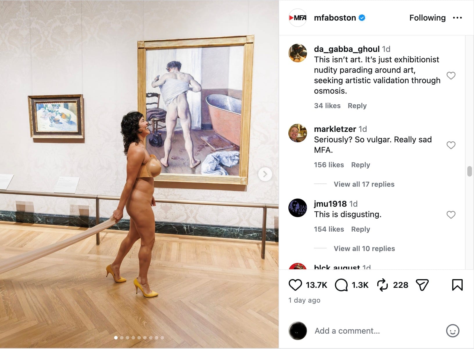 Others labeled it as “disgusting,” “vulgar,” “exhibitionist,” and even “public indecency.” Despite the online uproar, an MFA Boston spokesperson told Hyperallergic that only two complaints were formally lodged with the museum.