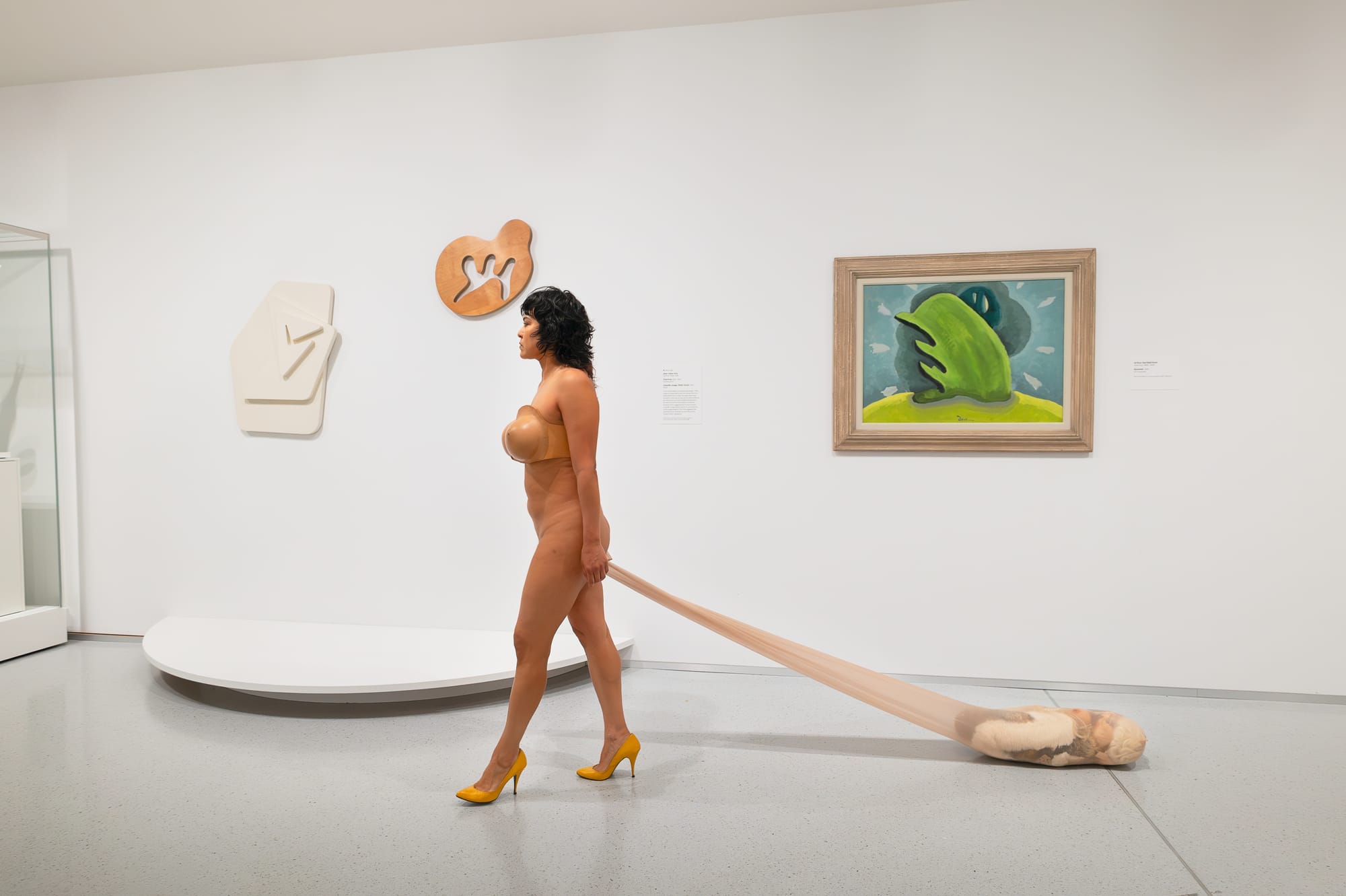 “Nude Laughing” took place during the museum’s Third Thursday, when entry fees are reduced to $5. Ibarra appeared in the Contemporary wing, adorned in a breastplate and yellow heels, pulling a sack filled with blonde wigs and exaggerated feminine items, which she termed “white lady accoutrements.”