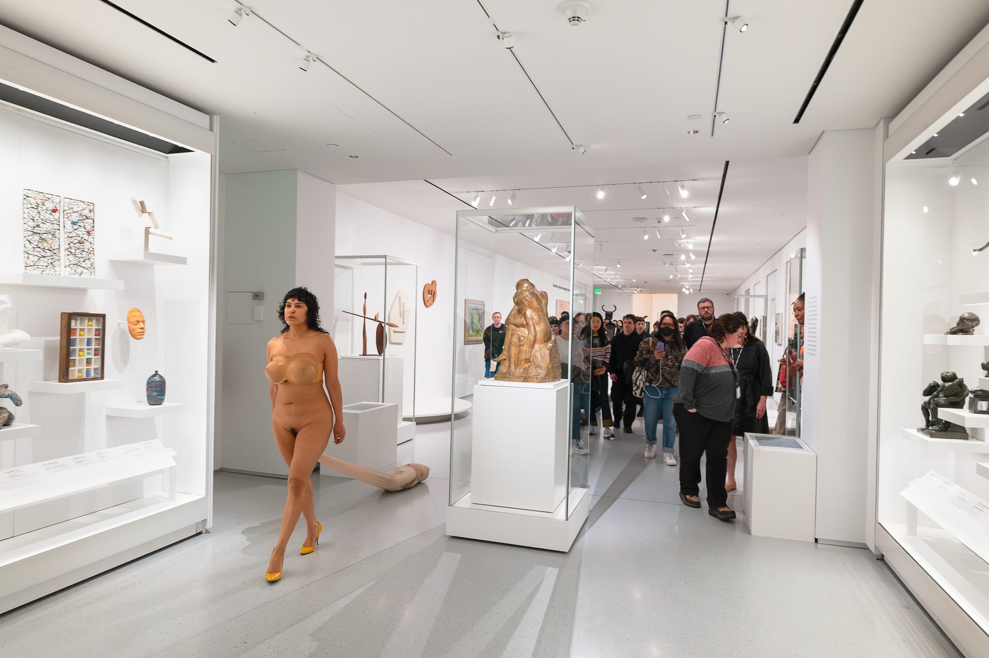 A large audience follows Xandra Ibarra throughout the galleries, maintaining a cautious distance. (photo Kannetha Brown, courtesy MFA Boston)
