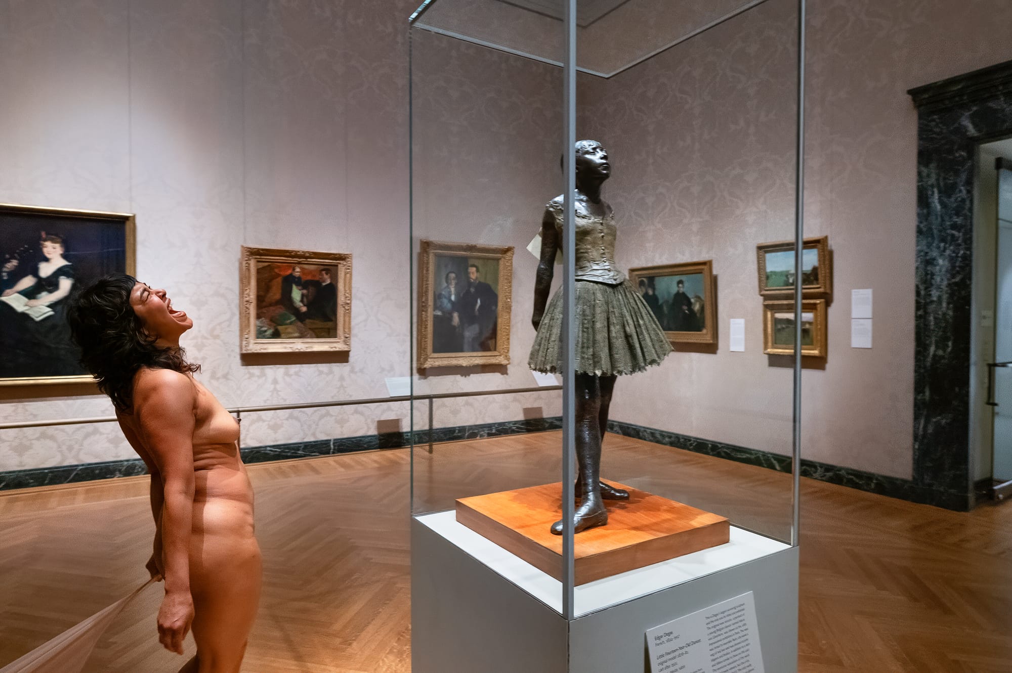 Xandra Ibarra laughs with, or at, Edgar Degas’s “Little Fourteen Year Old Dancer” (cast in 1921), locked in her protective case. (photo Kannetha Brown, courtesy MFA Boston)