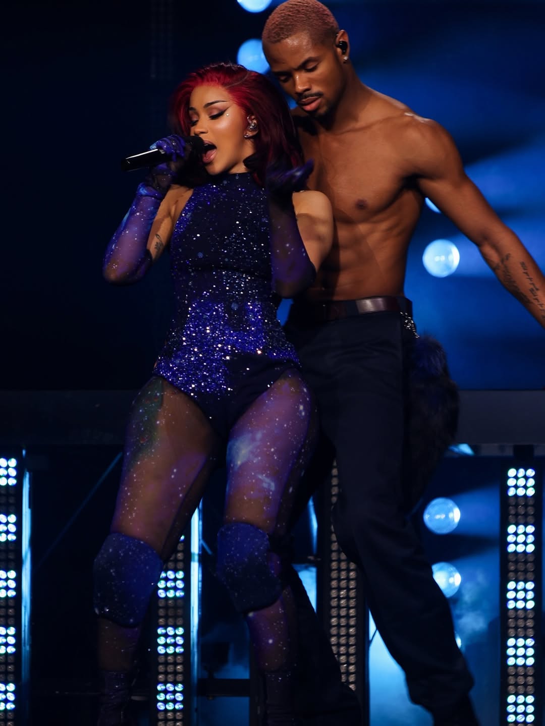 Cardi B kicked off the Little Miss Drama Tour with a striking custom catsuit by Valdrin Sahiti. This body-hugging piece set the eveningâs tone, blending couture craftsmanship with bold stage allure.