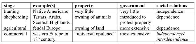 in which authority and subordination are more perfectly established” (WN V.i.b.7). While dire poverty characterizes life in the hunting stage, the shepherding stage is marked by the subservience of all but the wealthiest individuals.