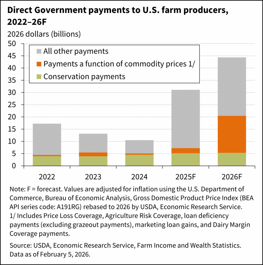 The USDA’s Economic Research Service recently calculated annual direct payments to farmers from 2022 onward and projected spending through 2026. The graph shows that while conservation payments have remained stable, price support and other payments, after a slight decline post-pandemic, are set to surge this year.