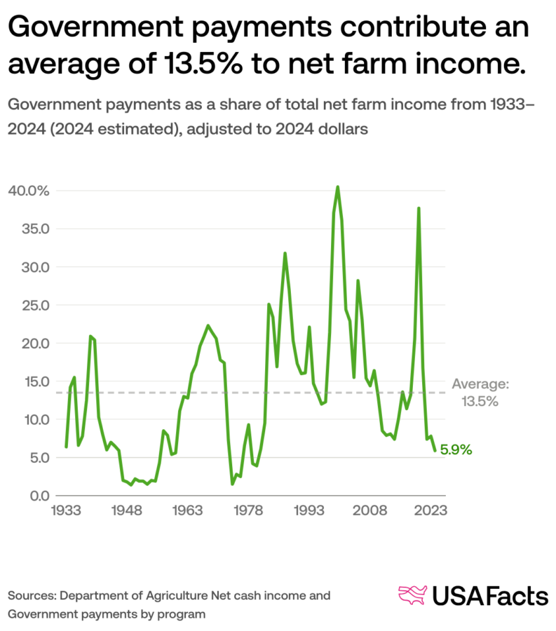 Let’s consider what these USDA programs share: the distribution of public funds to farming operations. Despite common perceptions of agriculture as a free-market enterprise, it’s heavily subsidized. According to USDA data, USAFacts estimates that since 1933, federal agricultural subsidies have averaged 13.5% of net farm income.